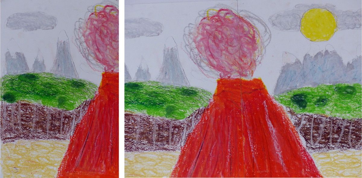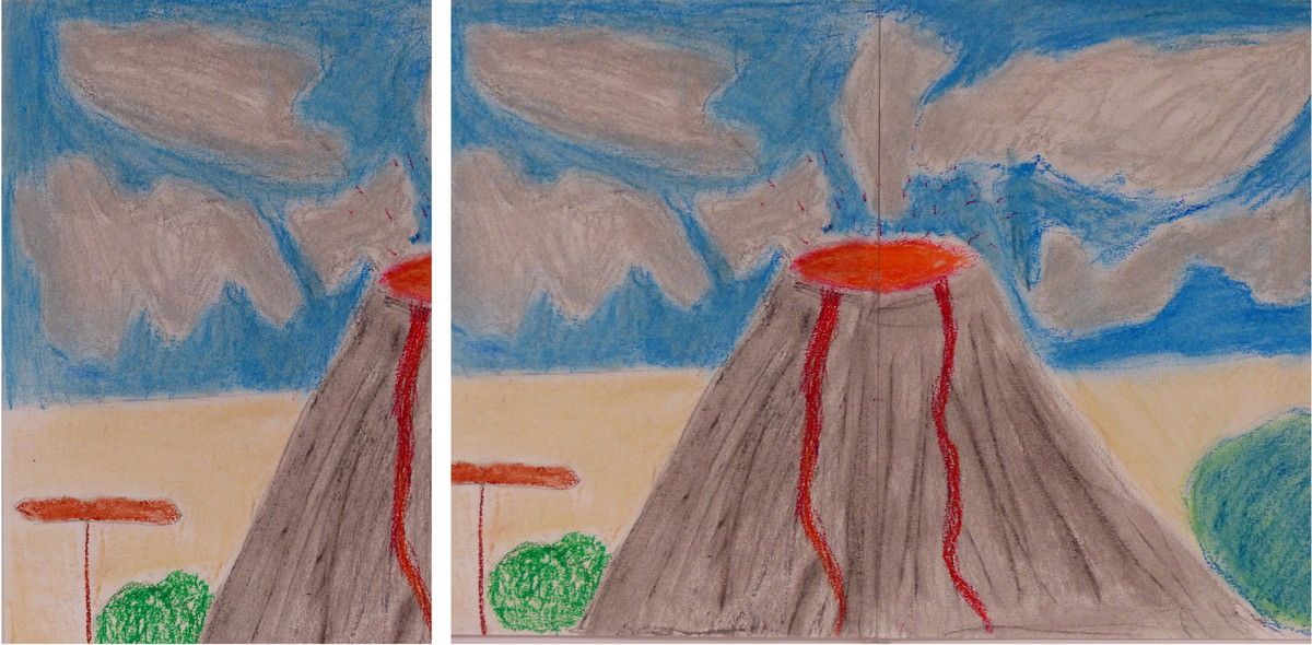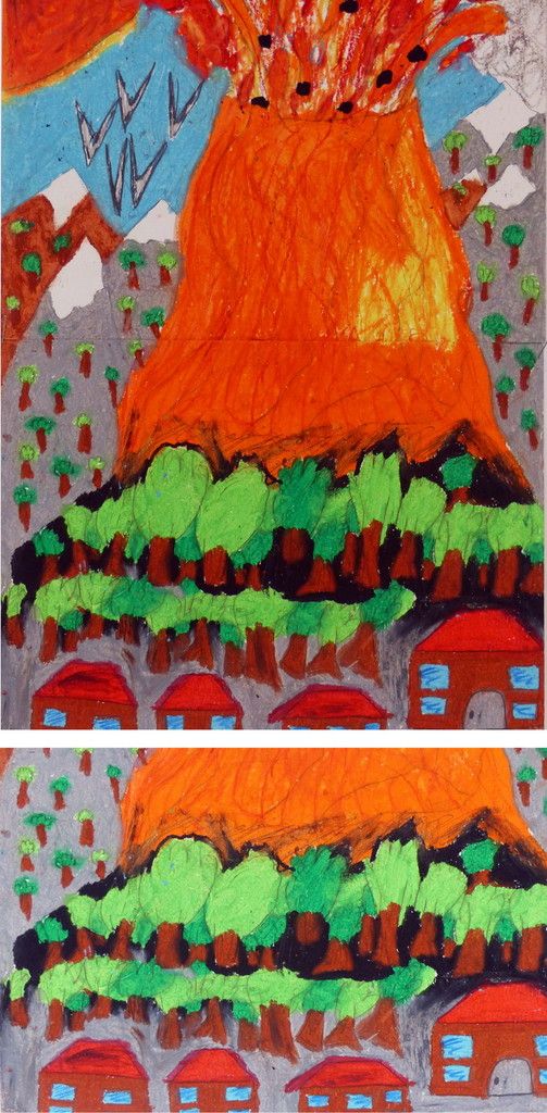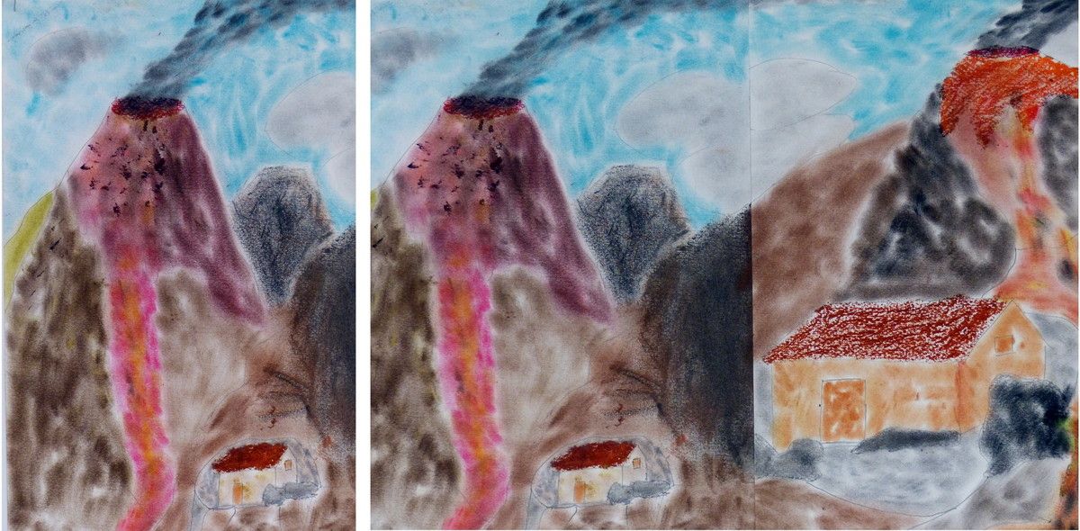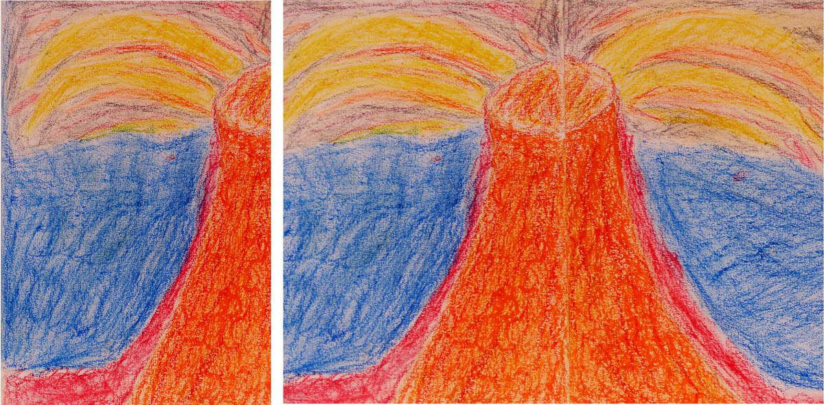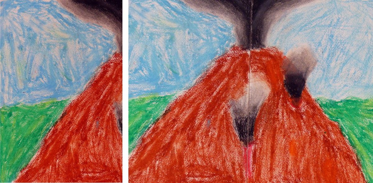 « Un volcan sur la montagne se réveille… des nuages pelotonnés de vapeur se massent dans le ciel. Et puis, le volcan éclate, explose.